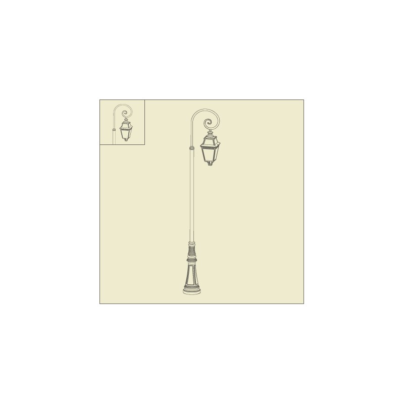 Le lampadaire Place des Vosges 3 mesure 3m30, le haut du pied est courbé et suspend le luminaire, il est équipé d'un solide diffuseur à verre clair afin d'obtenir une lumière franche. Il supporte très bien d'une ampoule halogène de 105 watts maximum, ou d'une ampoule basse consommation, LED de 30 watts ne dépassant pas 200 mm de long.